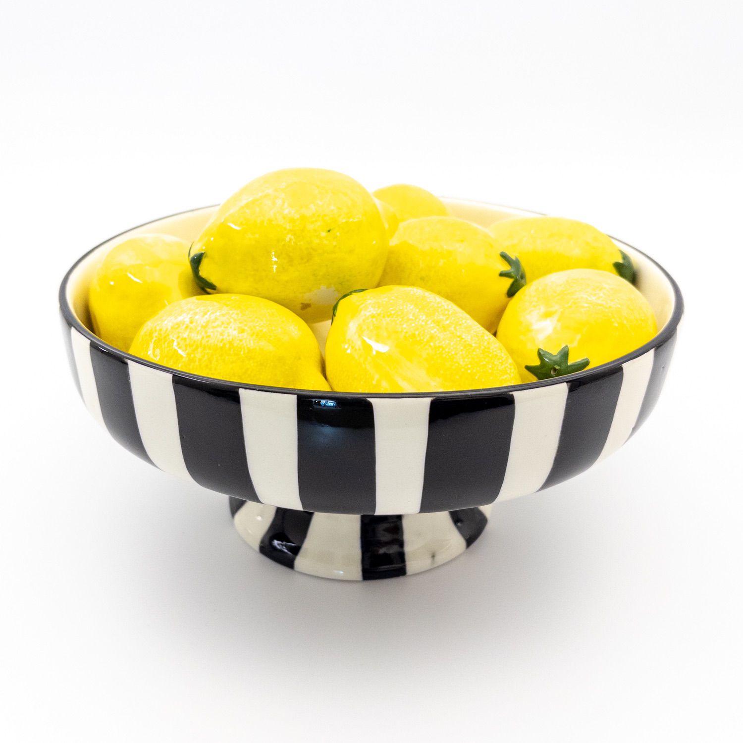 Brighten up your space with this charming ceramic lemon bowl set. Featuring a stylish black-and-white striped pedestal bowl filled with glossy, lifelike yellow lemons, it adds a fresh and vibrant touch to any kitchen or tabletop. Perfect as a decorative centerpiece, it blends modern design with playful, fruit-inspired appeal.